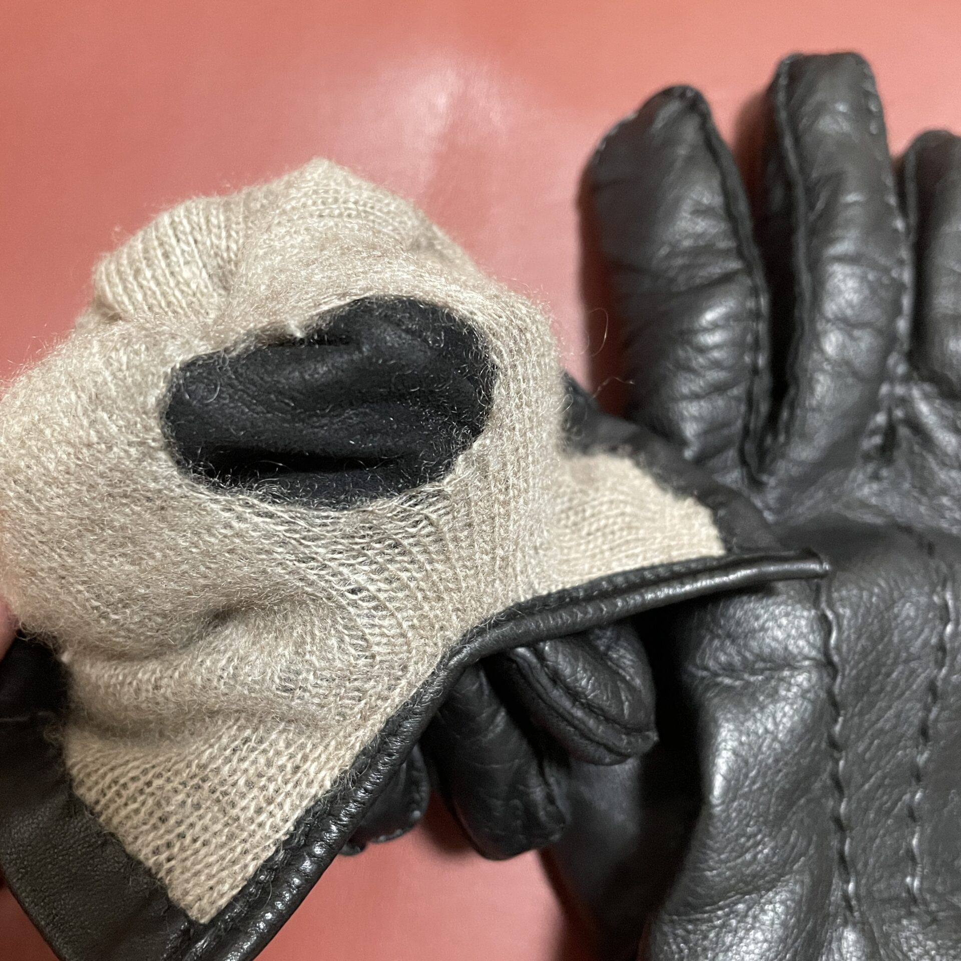 左手のライニングは穴が開いてしまいましが。