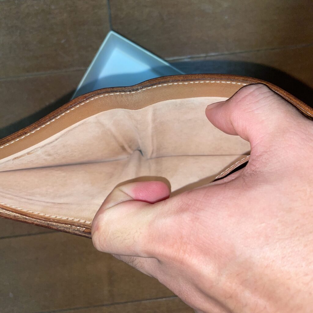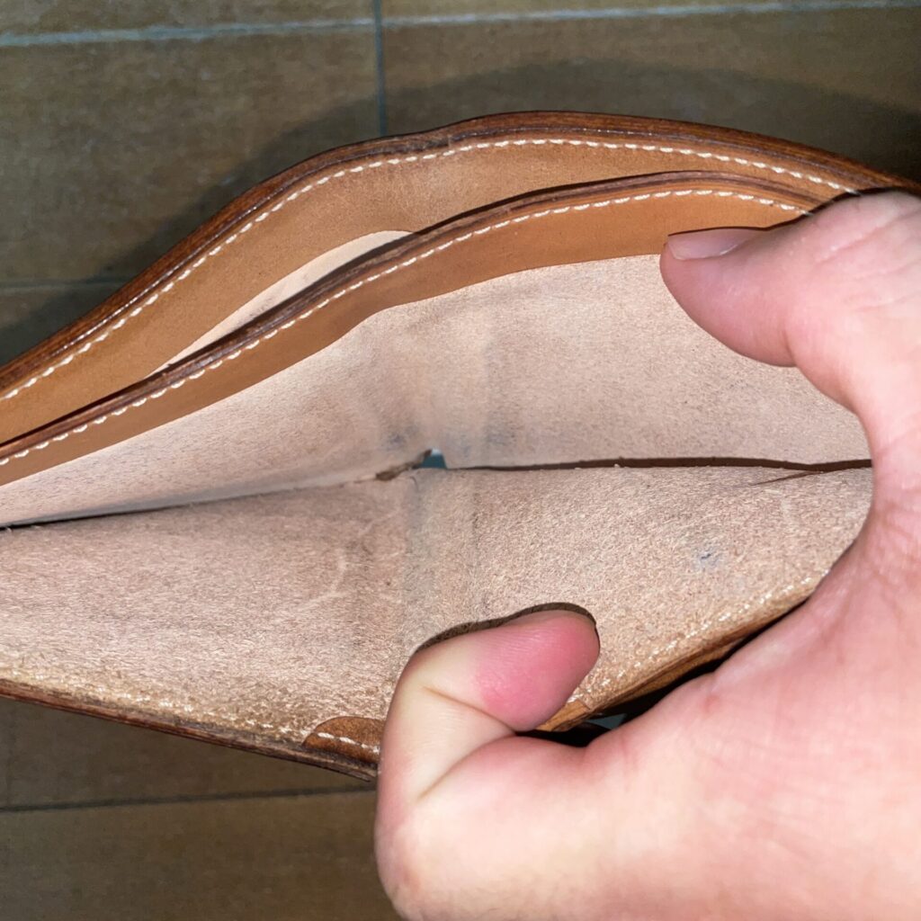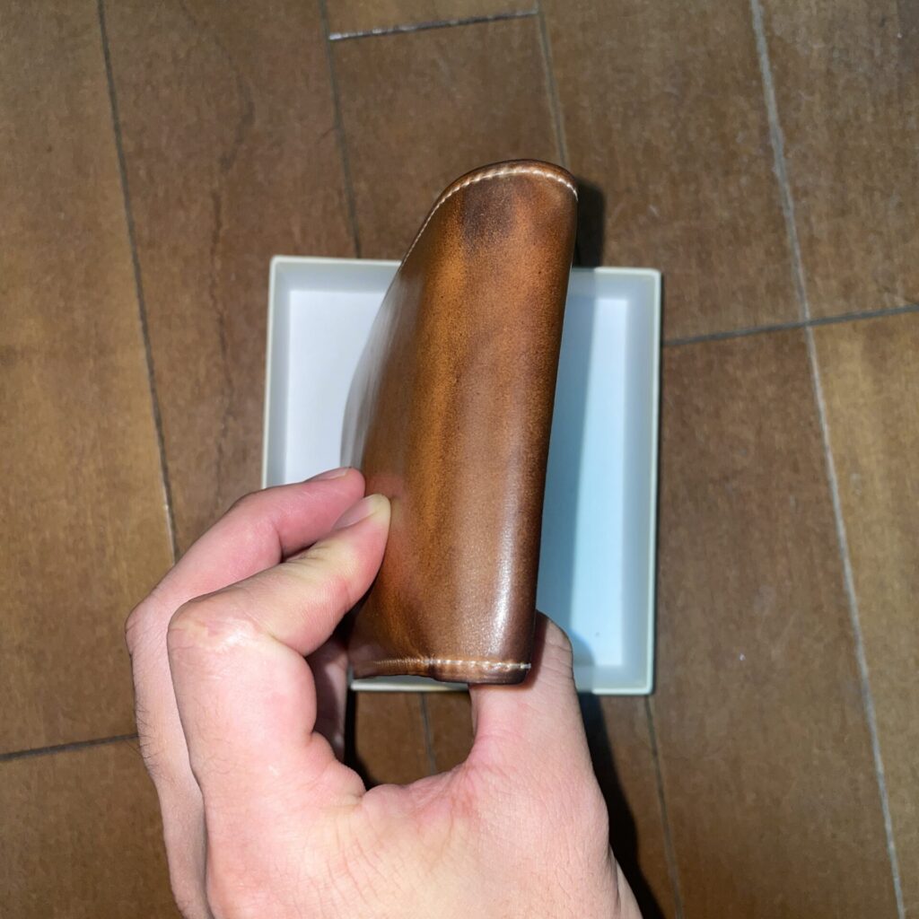 折財布だと普通はここに皺がくっきり入ってしまうんですが、コードバンの構造上全く入らないです。