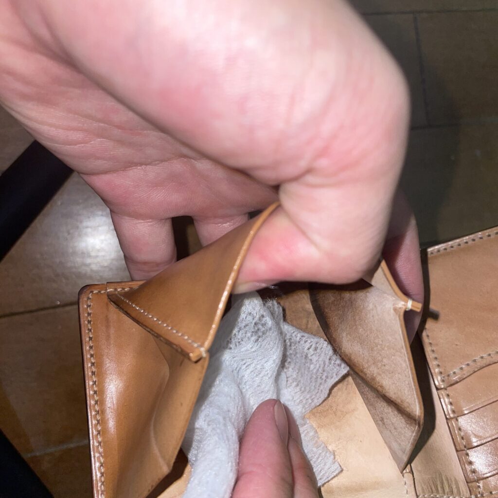 小銭入れや札入れの内部をしっかりこすり、他の部分はシミにならないように軽くふき取ります。