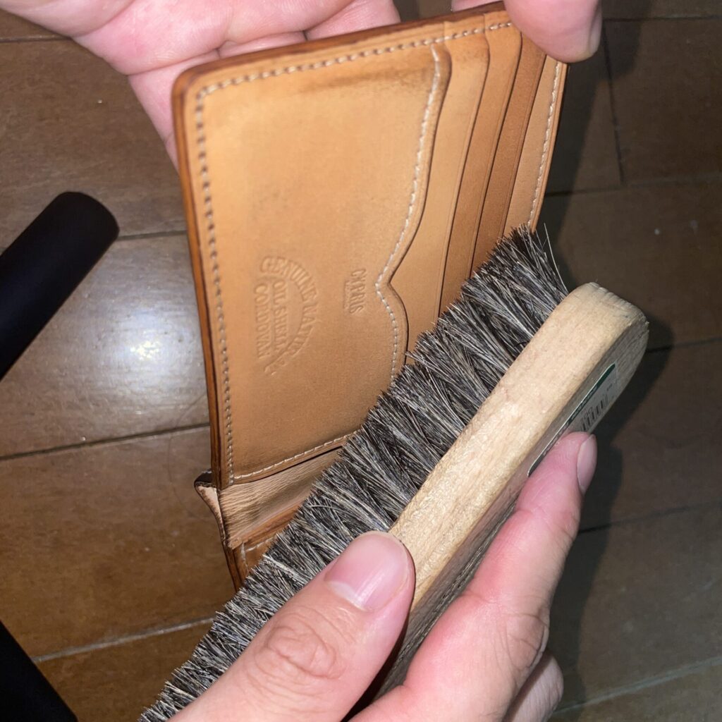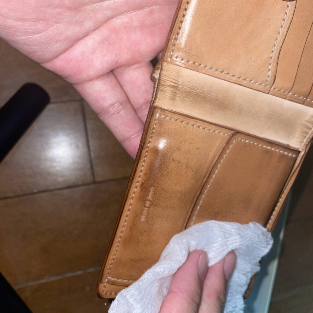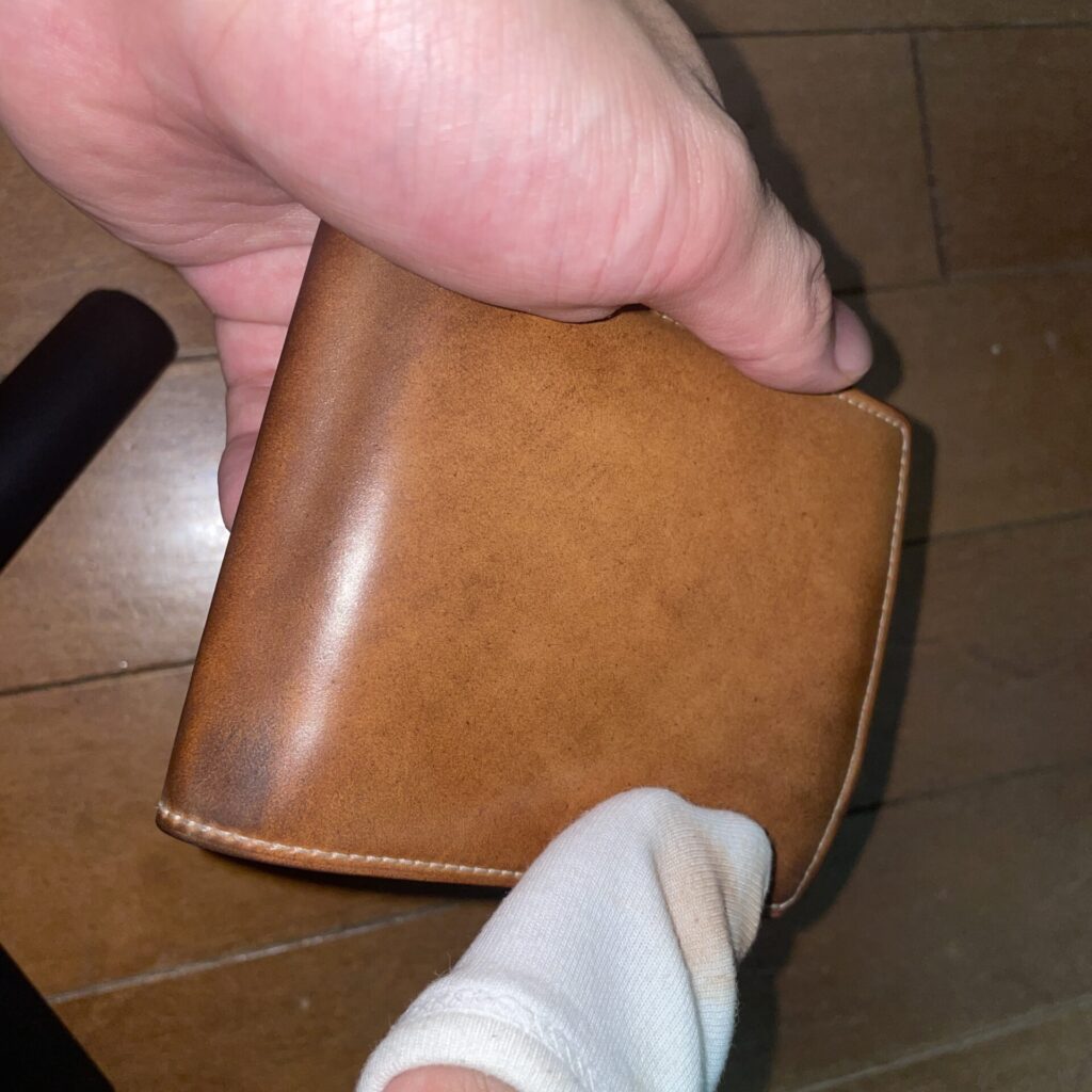 この時、財布を寝かせて置いておくと塗ったワックスが接触している部分に移ってしまうので、立てたりハンガーでぶら下げたりするなど、工夫すると安心です。