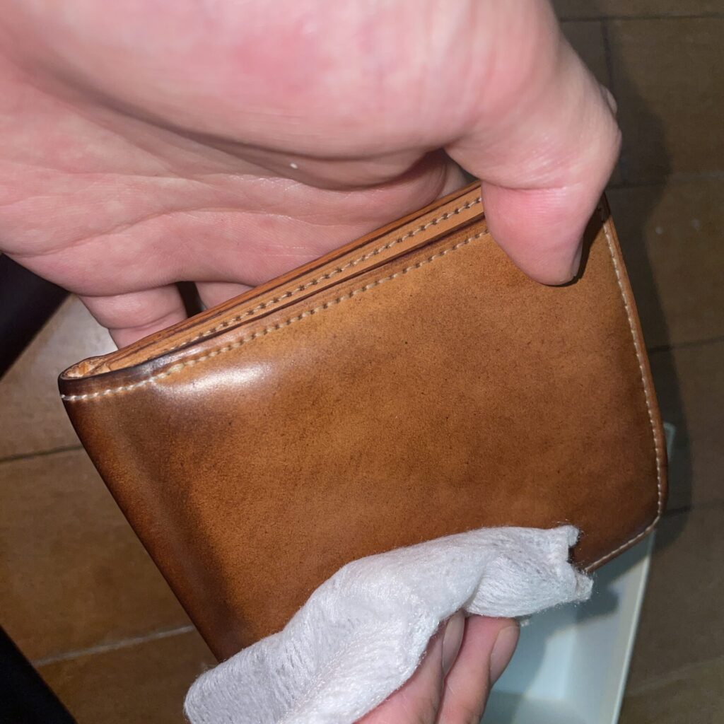 艶が出やすいクリーム、ワックスはたくさんありますが、長谷革屋のコードバンワックスは艶が長く続く気がします。