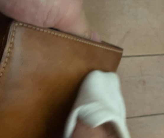 ここでは強くこするのではなく、布に着けたワックスを少しずつ革に乗せて広げていくように塗っていきます。